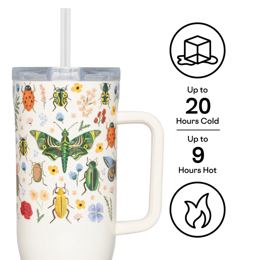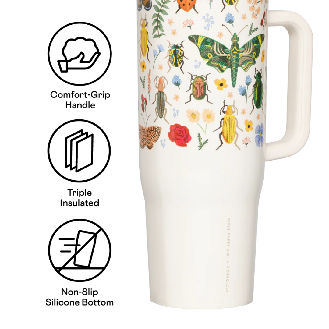 Let the joyrides commence. Cruiser, our largest straw cup to date, keeps 40 oz of your favorite beverage cold for up to 20 hours, allowing you to enjoy everyday adventures without giving your hydration needs a second thought. It features an exclusive dual-function sip + straw spill-proof lid, a comfy soft-grip handle, and a stay-put silicone bottom to keep it upright no matter your destination or how many stops you take on the way. Now available in Rifle Paper Co.'s iconic curio pattern.