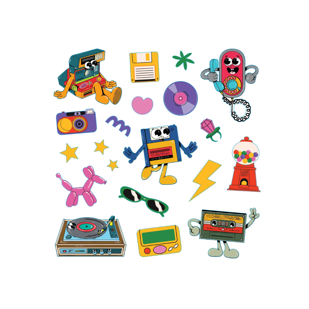 Encontrarás pegatinas de teléfonos fijos, disquetes, casetes, máquinas de chicles, estrellas y puntos con estampados y colores neón, donas, café, fruta, videojuegos, flores, deportes, emoticonos, soles y mucho más.