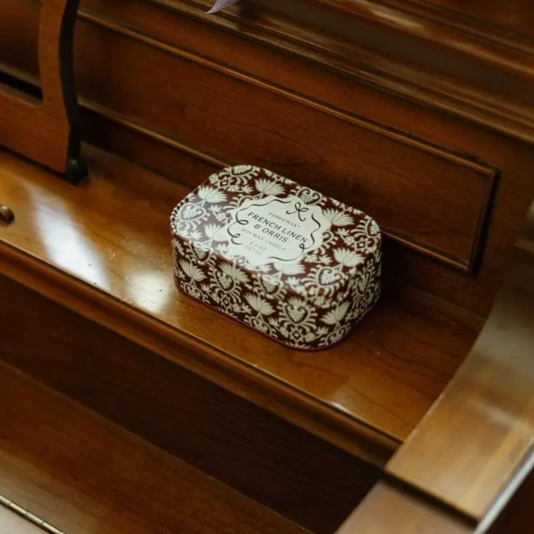The French Linen & Orris Chérie 4.5 oz Tin Candle comes in a patterned tin with a hinged lid, two wicks, and a removable label. Fragrance notes include bergamot, eucalyptus, French lavender, salted fig, tonka bean, and sea-soaked woods. After burning, the tin repurposes easily as a trinket or jewelry holder.